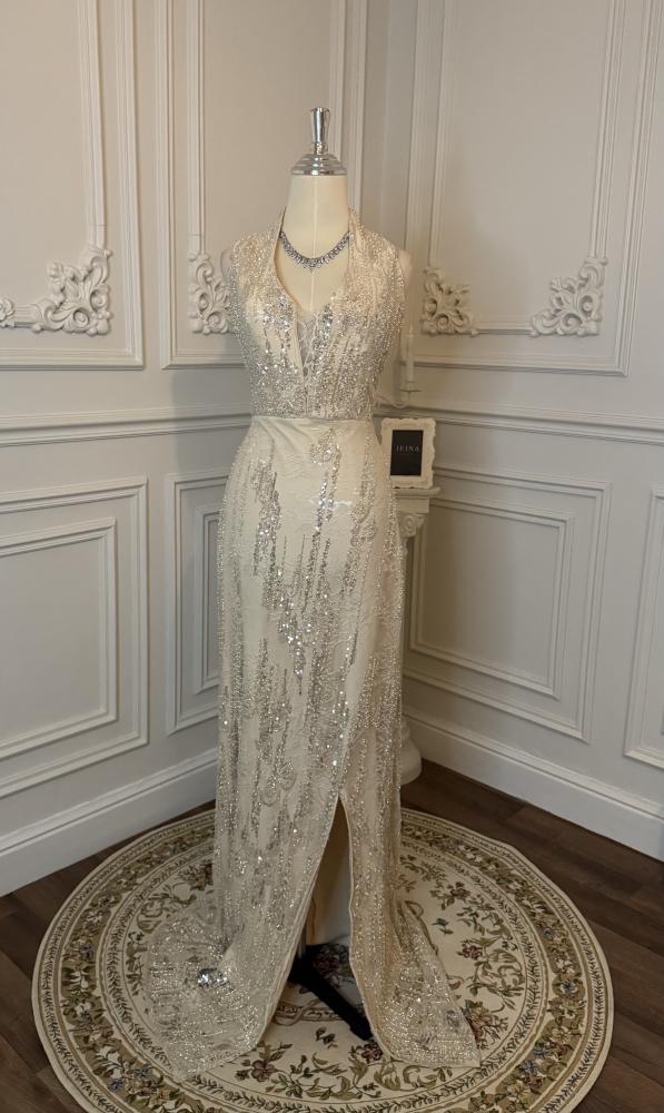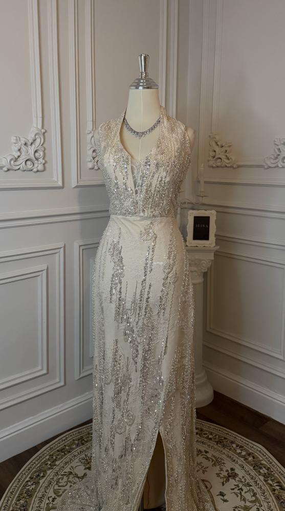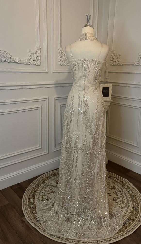 تصميم سمكة يبرز جمال القوام، مصنوع من دانتيل فاخر مطرز بالخرز والشك اليدوي بأسلوب راق ومترف يوحي بالفخامة، وطول ١٥٠ سم