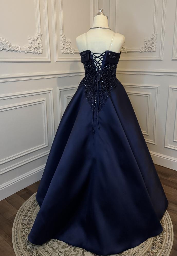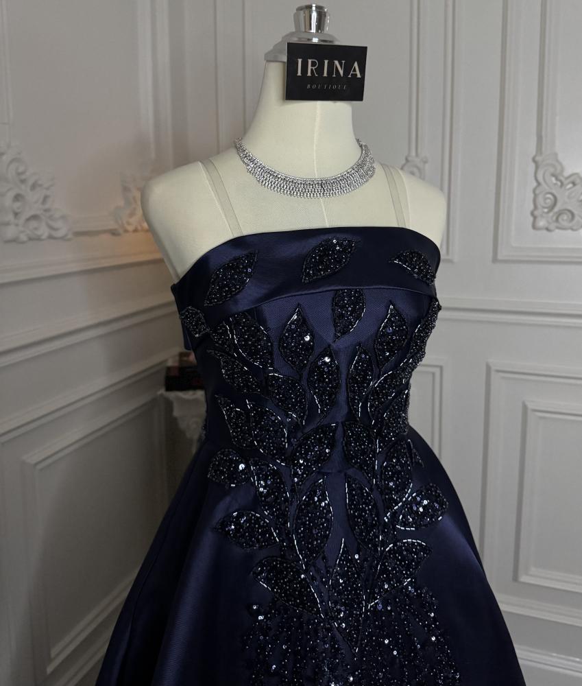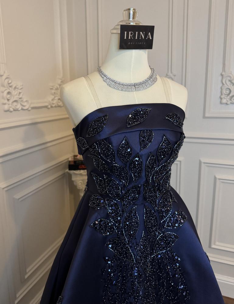 فستان فخم من قماش الميكادو المطرز باللون الكحلي.